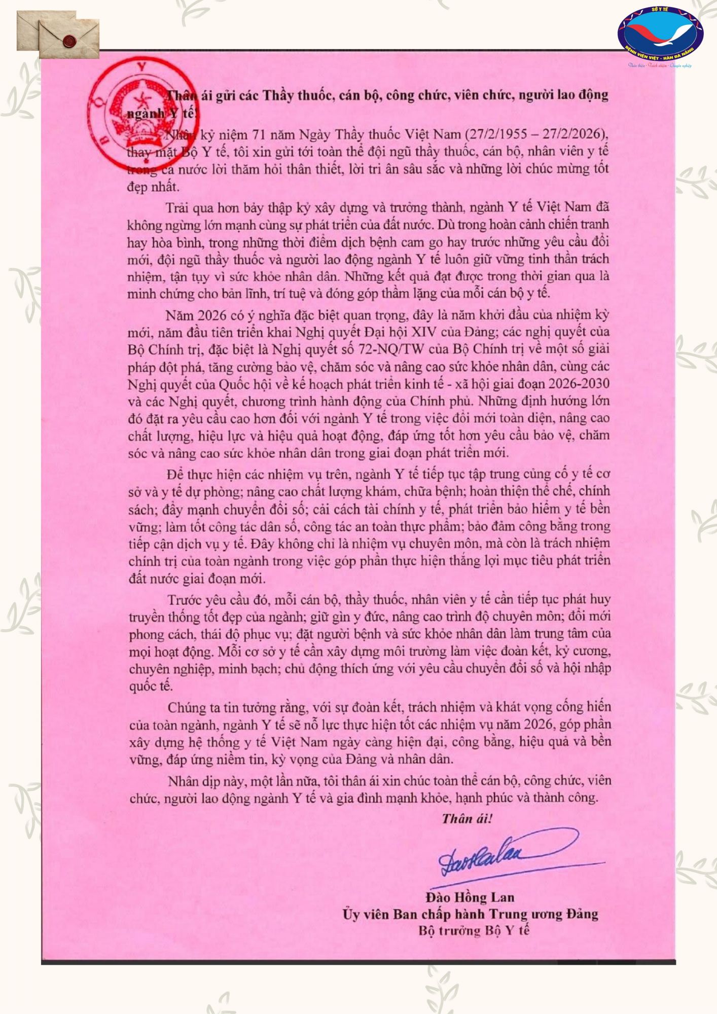 Bộ trưởng Bộ Y tế Đào Hồng Lan gửi thư tới các Thầy thuốc, cán bộ, công chức, viên chức, người lao động ngành Y tế nhân kỷ niệm 71 năm Ngày Thầy thuốc Việt Nam (27/02/1955 – 27/02/2026)