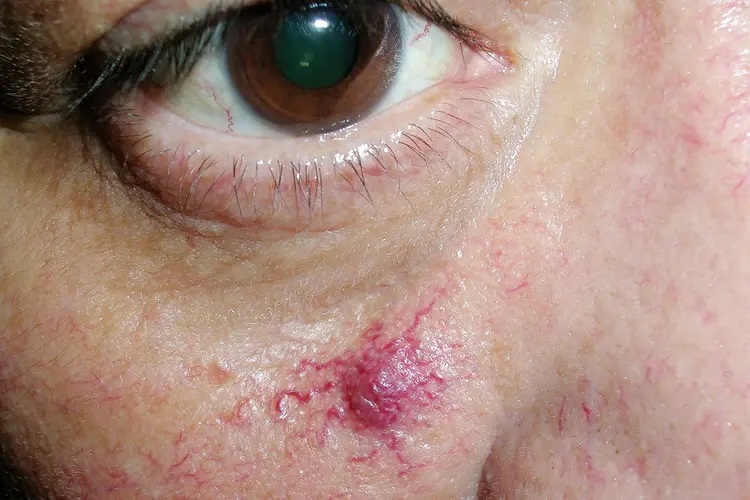 Giãn tĩnh mạch mạng nhện là những mạch máu nhỏ hơn, màu đỏ, tím và xanh lam, chúng cũng ngoằn ngoèo và uốn lượn. Giãn tĩnh mạch mạng nhện cũng dễ dàng nhìn thấy qua da. Chúng ảnh hưởng đến các mao mạch, là những mạch máu nhỏ nhất trong cơ thể . Giãn tĩnh mạch mạng nhện, có màu đỏ hoặc xanh lam, trông giống như mạng nhện hoặc cành cây. Chúng thường dễ thấy ở chân và mặt.U mạch mạng nhện hay dây thần kinh mạng nhện là một dạng phát triển phổ biến của các mạch máu nhỏ. Tên gọi của nó xuất phát từ hình dạng thường thấy, với một mạch máu đỏ ở trung tâm và các mao mạch nhỏ tỏa ra từ đó, tạo nên hình dáng giống như một con nhện. Cụm mạch máu này lành tính và không gây hại. (Ảnh: Richard Usatine, MD)