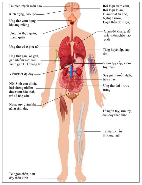 Không chỉ ảnh hưởng đến thể chất, rượu bia còn tác động nghiêm trọng đến sức khỏe tâm thần. Uống rượu bia kéo dài hoặc quá mức có thể gây suy giảm trí nhớ, rối loạn hành vi, lo âu, trầm cảm, loạn thần, thậm chí làm tăng nguy cơ tự sát. Ngoài ra, rượu bia còn làm suy giảm miễn dịch, đẩy nhanh quá trình lão hóa, gây hội chứng nhiễm độc rượu ở bào thai và khiến trẻ sinh ra nhẹ cân.