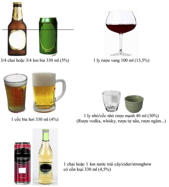 Để giảm thiểu tác hại của rượu bia, Bộ Y tế khuyến cáo: nam giới không uống quá 2 đơn vị cồn/ngày, nữ giới không quá 1 đơn vị cồn/ngày. Một đơn vị cồn tương đương với 1 lon bia 330ml, 1 ly rượu vang 120ml hoặc 1 chén rượu mạnh 30ml. Những người mắc bệnh gan, tim mạch, gout, đái tháo đường, phụ nữ mang thai, người đang dùng thuốc hoặc làm việc với máy móc nguy hiểm cần tránh hoặc hạn chế nghiêm ngặt rượu bia.