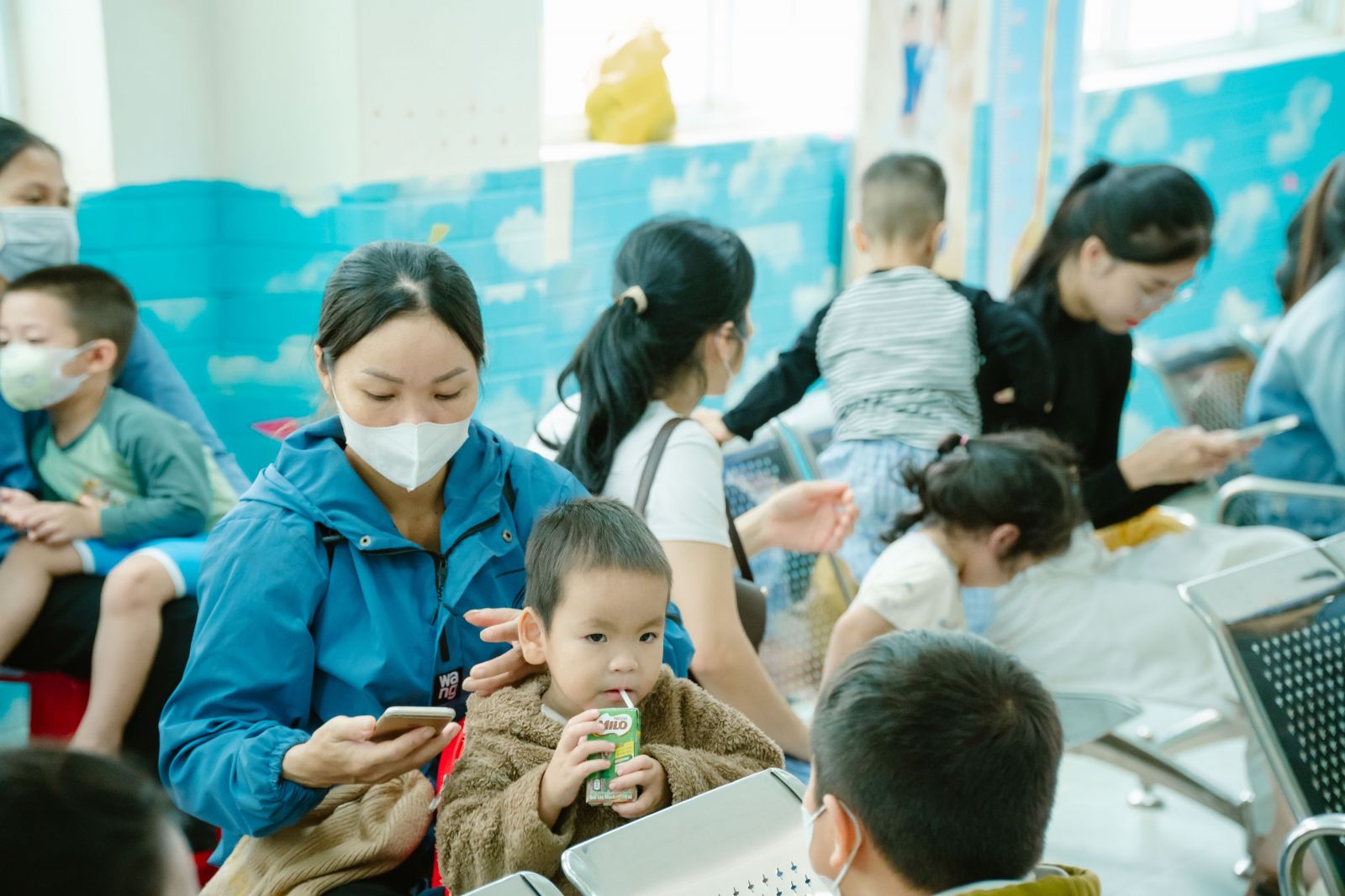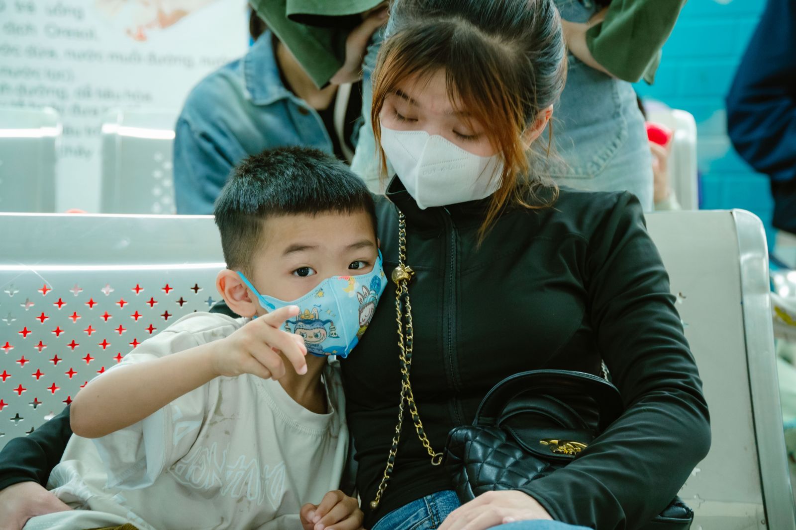 Hành lang, khu vực chờ khám luôn đông đúc, nhiều phụ huynh đưa con đến vì các triệu chứng ho, sốt, sổ mũi, khó thở – biểu hiện đặc trưng của các bệnh lý hô hấp do thời tiết chuyển lạnh.