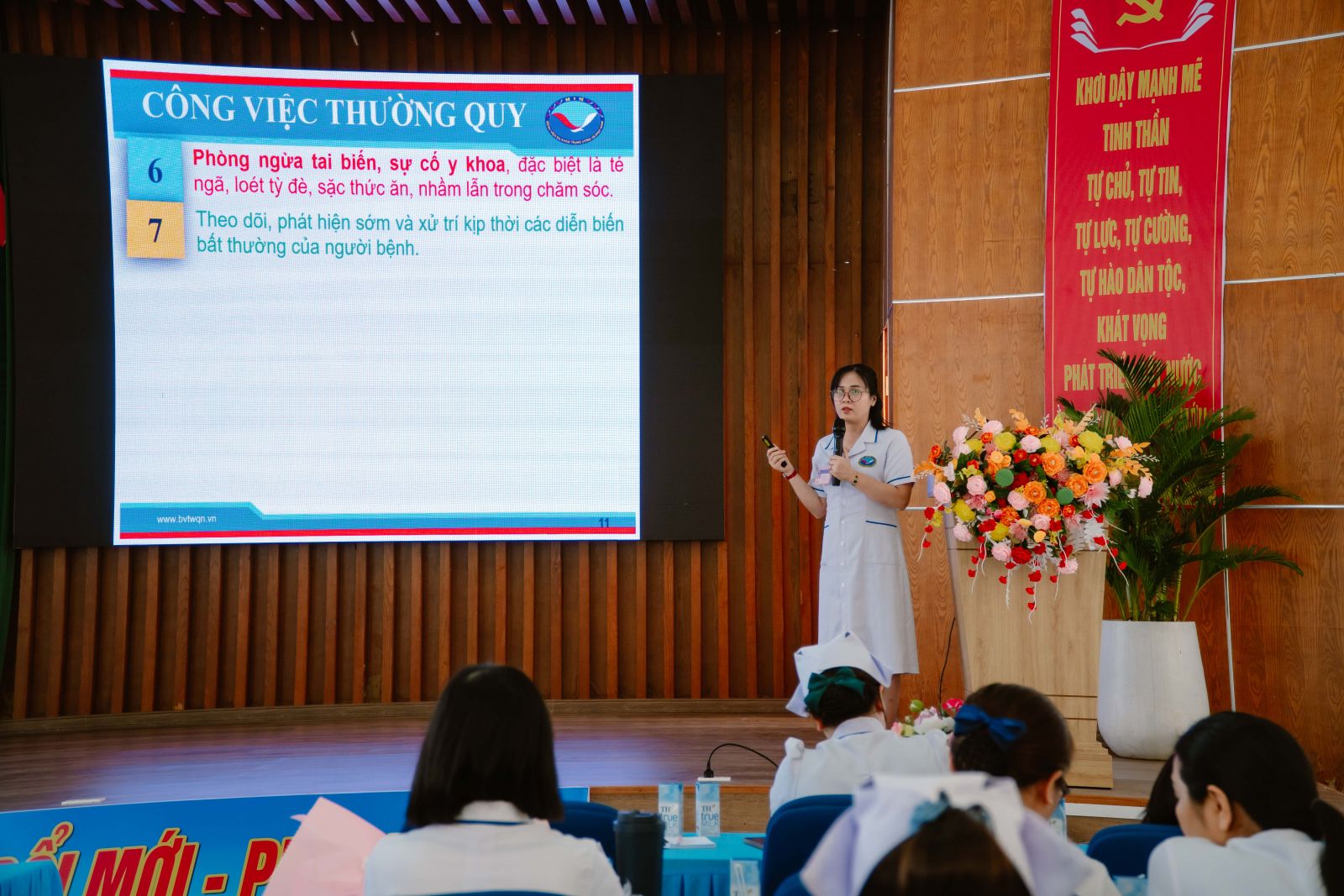 CN. Huỳnh Thị Tư – Phó trưởng Phòng Điều dưỡng báo cáo hoạt động điều dưỡng năm 2025.