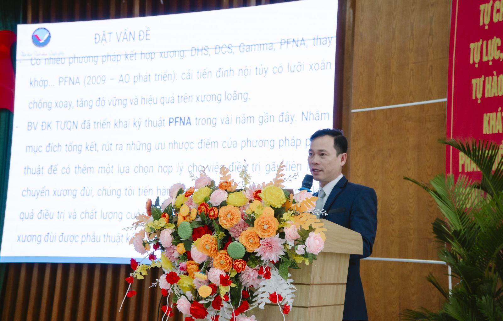 Báo cáo chuyên đề thứ ba do BSCKII. Trịnh Anh Hoàng – Phó Trưởng Khoa Ngoại chấn thương, Phó Trưởng phòng Kế hoạch tổng hợp trình bày với chủ đề: “Đánh giá kết quả điều trị và chất lượng cuộc sống ở bệnh nhân gãy liên mấu chuyển xương đùi được phẫu thuật kết hợp xương bằng đinh PFNA tại Bệnh viện Đa khoa Trung ương Quảng Nam”.