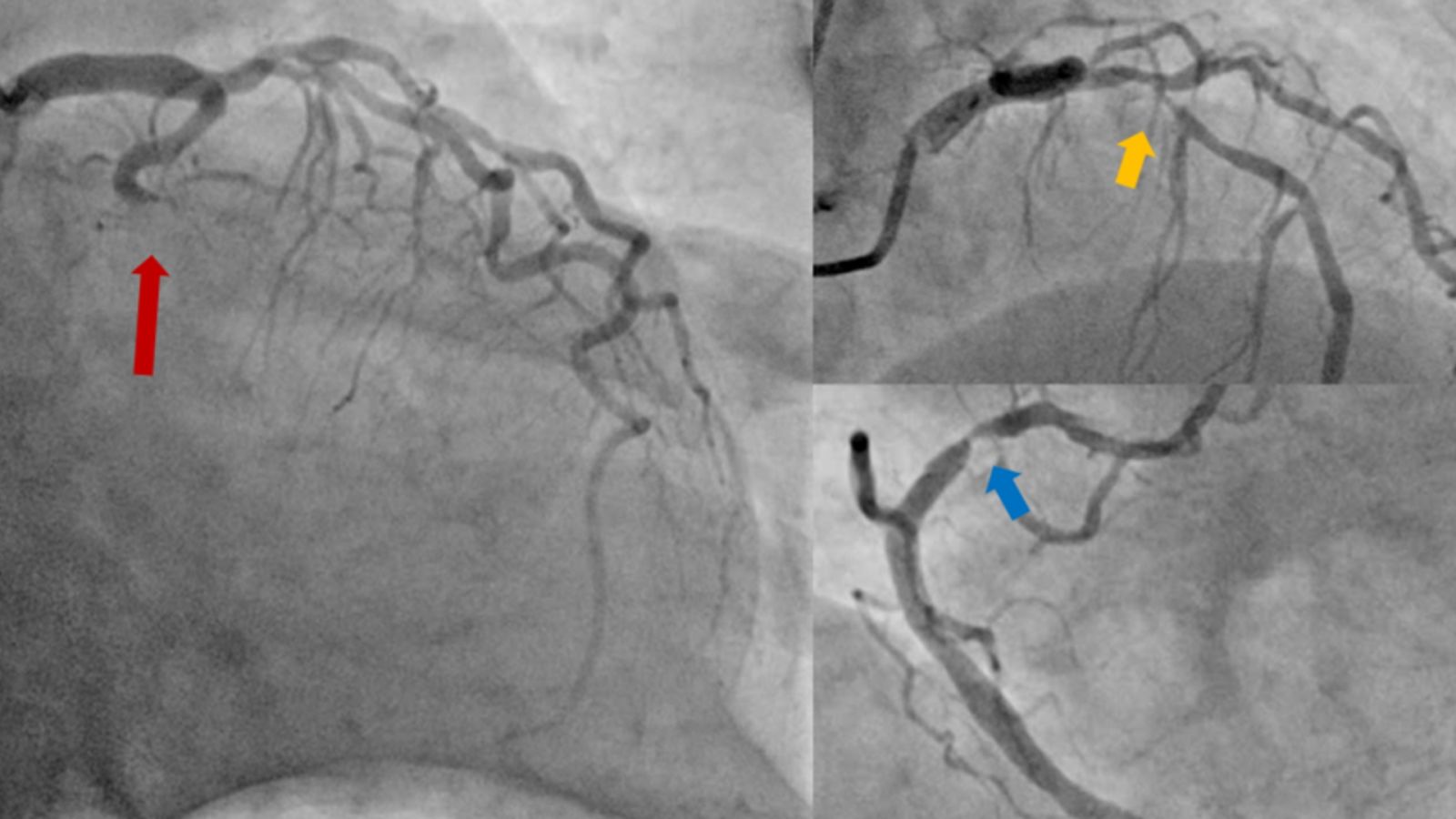 Hình ảnh chụp động mạch vành cho thấy tắc hoàn toàn động mạch mũ (mũi tên đỏ), hẹp nặng cả động mạch liên thất trước (mũi tên vàng) và động mạch vành phải (mũi tên xanh).