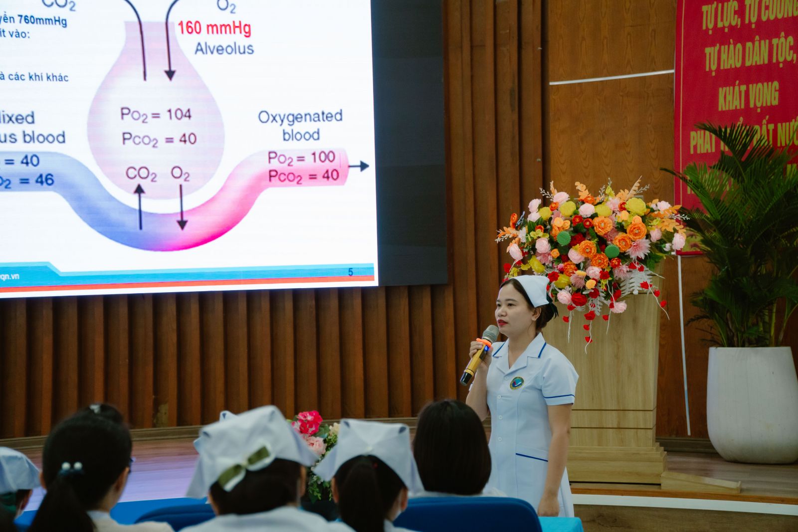 Báo cáo đã hệ thống lại những khái niệm cơ bản về giảm oxy máu và giảm oxy mô, giúp người tham dự phân biệt rõ hai tình trạng thường gặp. Đồng thời, bài giảng nhấn mạnh các chỉ số theo dõi quan trọng như PaO₂, SaO₂, SpO₂, CaO₂ và phân tích những nguyên nhân chính gây giảm oxy.