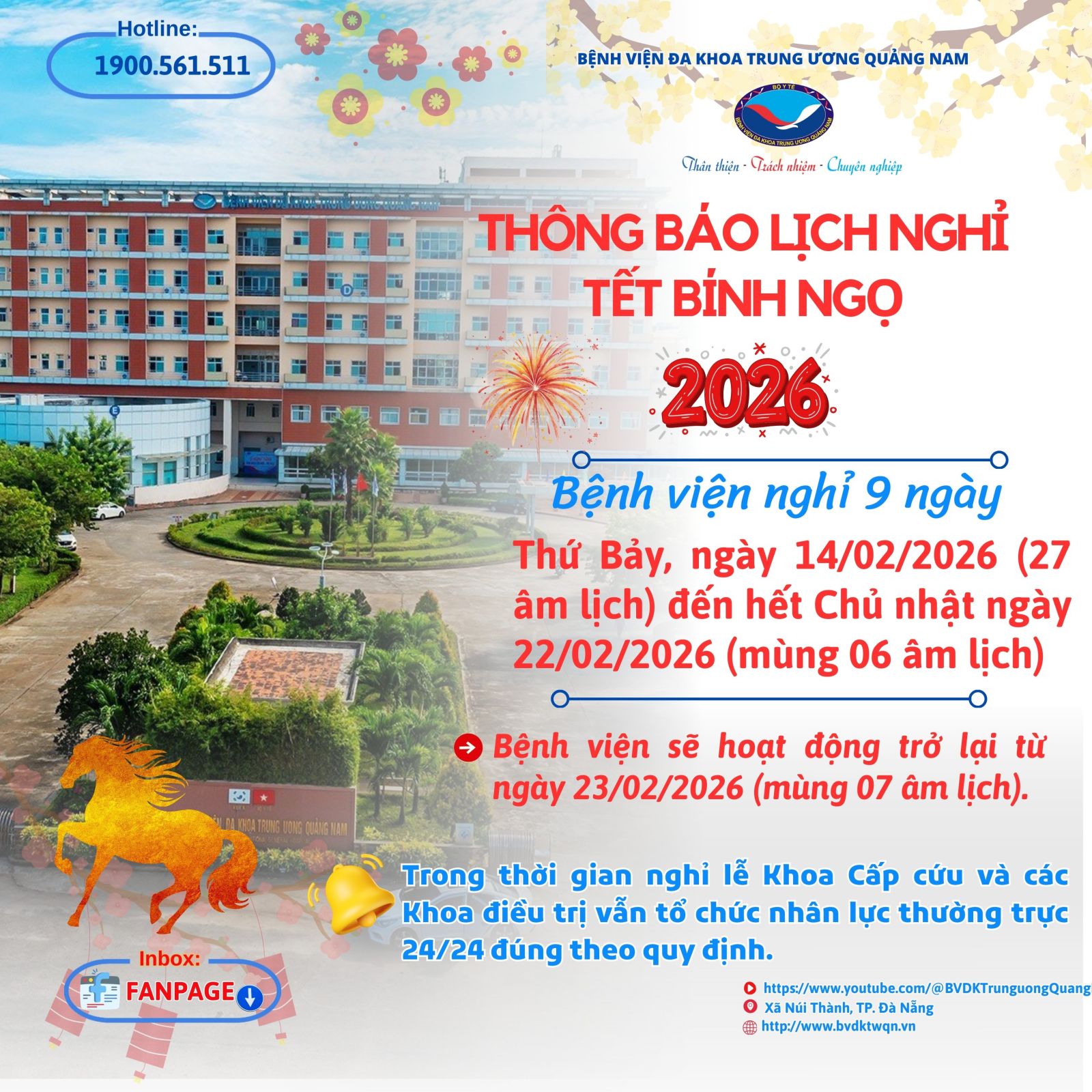 Nhân dịp năm mới Xuân Bính Ngọ 2026, Bệnh viện Đa khoa Trung ương Quảng Nam trân trọng gửi đến Quý khách hàng cùng gia đình lời chúc năm mới an khang – hạnh phúc – bình an và thành công.