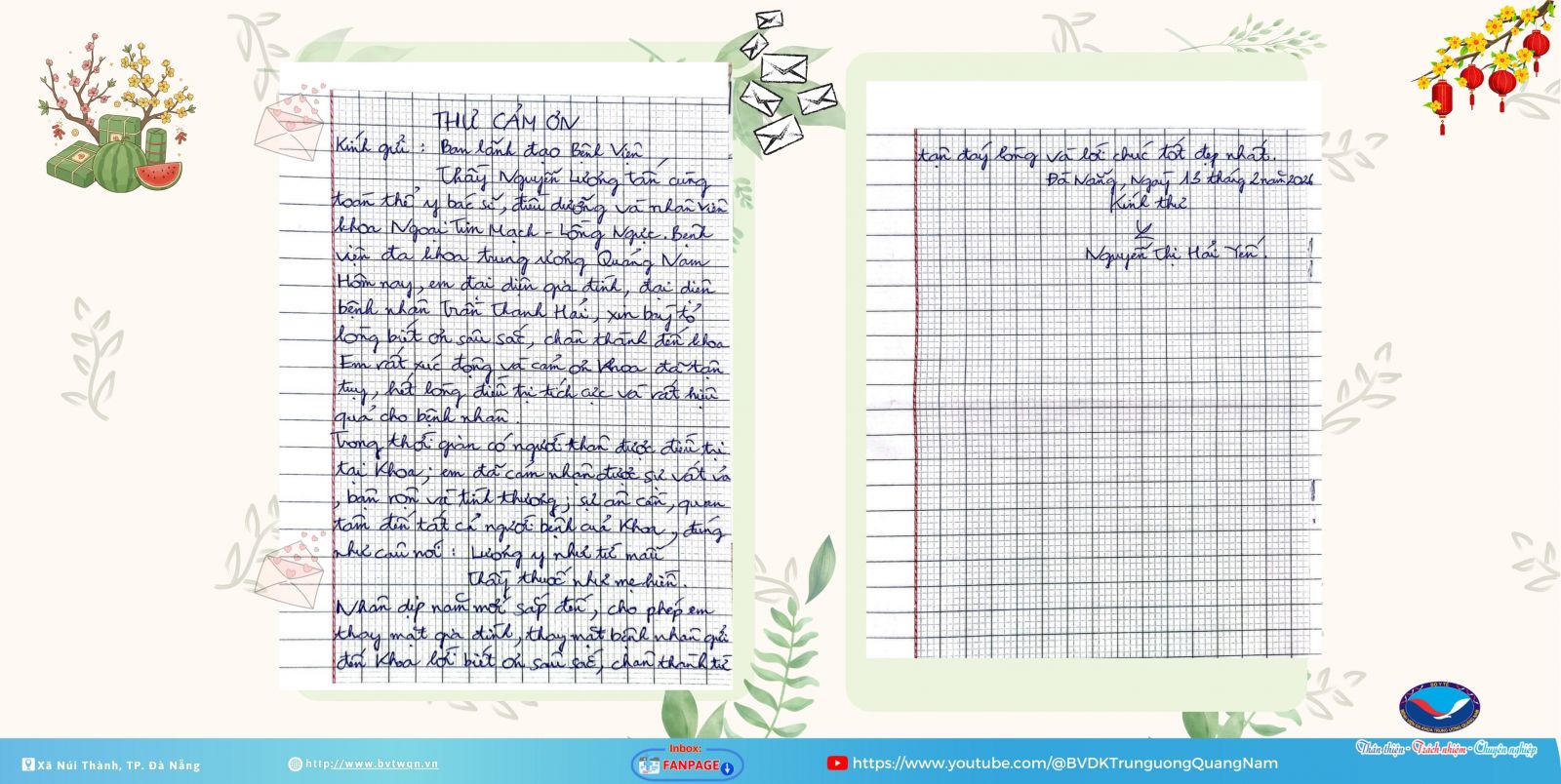 Trong những ngày cuối năm chuẩn bị đón chào năm mới Nguyên đán Bính Ngọ 2026, Bệnh viện Đa khoa Trung ương Quảng Nam nhận được thư cảm ơn chân thành từ gia đình người bệnh Trần Thanh Hải gửi đến Lãnh đạo Bệnh viện cùng tập thể y bác sĩ, điều dưỡng Khoa Ngoại Tim mạch – Lồng ngực.