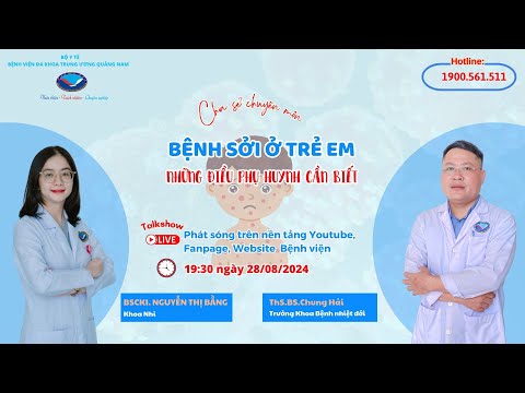 Để phụ huynh bảo vệ con yêu khỏi bệnh sởi, đến với số phát sóng truyền hình của Bệnh viện Đa khoa Trung ương Quảng Nam ngày hôm nay, kính mời quý phụ huynh cùng người dân đến với chia sẻ của ThS. Chung Hải – Trưởng khoa Bệnh Nhiệt đới và BSCKI. Nguyễn Thị Bằng khoa Nhi với chủ đề: “Bệnh sởi ở trẻ em và những điều phụ huynh cần biết”.